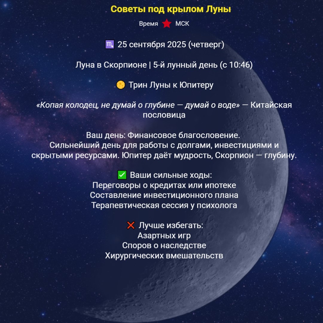 ♏ 25 сентября 2025 (четверг) Луна в Скорпионе | 5-й лунный день (с 10:46) 🌕 Трин Луны к Юпитеру (весь день) 💎 «Глубина и удача — сегодня можно быть смелым и правым» Друзья, сегодня — один из самых сильных дней цикла. Луна в Скорпионе, весь день в трине с Юпитером — мощная энергия для трансформации, роста, финансового прорыва. С 10:46 — 5-й лунный день — время развития, усиления, действия. ✅ Что делать: Запускайте проекты в сфере финансов, психологии, тайного Подойдёт: работа с долгами, инвестиции, очищение Хорошо: терапия, проработка травм, медитации Вечером — ведение дневника: «Что я готов отпустить?» ❌ Чего избегать: Поверхностных действий Конфликтов — особенно на тему денег Финансовых рисков без анализа Медицинских процедур Суеты 📌 «Сегодня не день для пассивности — день для осознанной силы». Пусть Скорпион напомнит: настоящее богатство — в глубине, а не в блеске. #лунныйкалендарь #лунавскорпионе #астрология #осознанность #25сентября #юпитер #астрологическийпрогноз