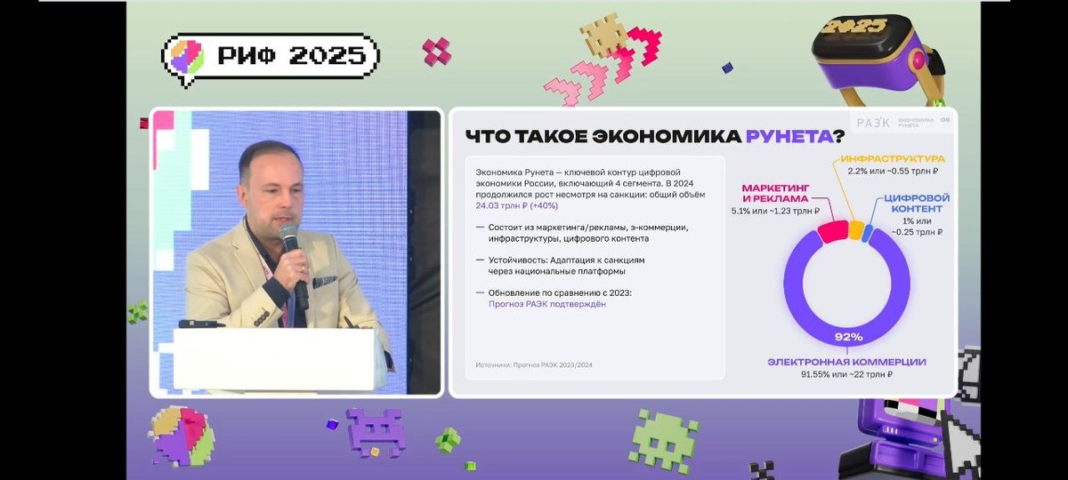 Всё хорошо! Отечественная ИТ-отрасль, не в пример многим другим, даёт внушительную динамику роста который год подряд. Вот так бы ещё в производстве, включая автомобилестроение и народное хозяйство, и тогда сложились бы те самые предпосылки для прорыва, о которых говорят последние годы. Но пока так. "Общий объем экономики российского сегмента интернета по итогам 2024 года вырос на 40% и составил более 24 трлн рублей. Об этом говорится в презентации "Экономика Рунета", которая была представлена в рамках РИФ-2025. Согласно данным презентации, направление "Маркетинг и реклама" выросло на 53%, составив 1,23 трлн рублей, направление "Инфраструктура" показало рост в 36%, достигнув 0,55 трлн рублей. "Электронная коммерция" выросла на 39%, достигнув 22 трлн рублей, а "Цифровой контент" показал рост в 53%, до 0,25 трлн рублей." (с) ТАСС ЛИ́НДРЕ 🫧