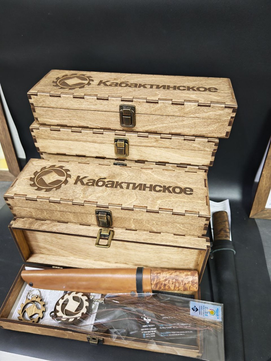 Изготовили 9 наборов для УК "Кабактинское". В наборе якутский нож (ножи изготовлены кузнецом из Намского улуса) с сертификатом, автоподвески с конским волосом и деревянный брелок. Все это в деревянной коробке с металлической фурнитурой👍