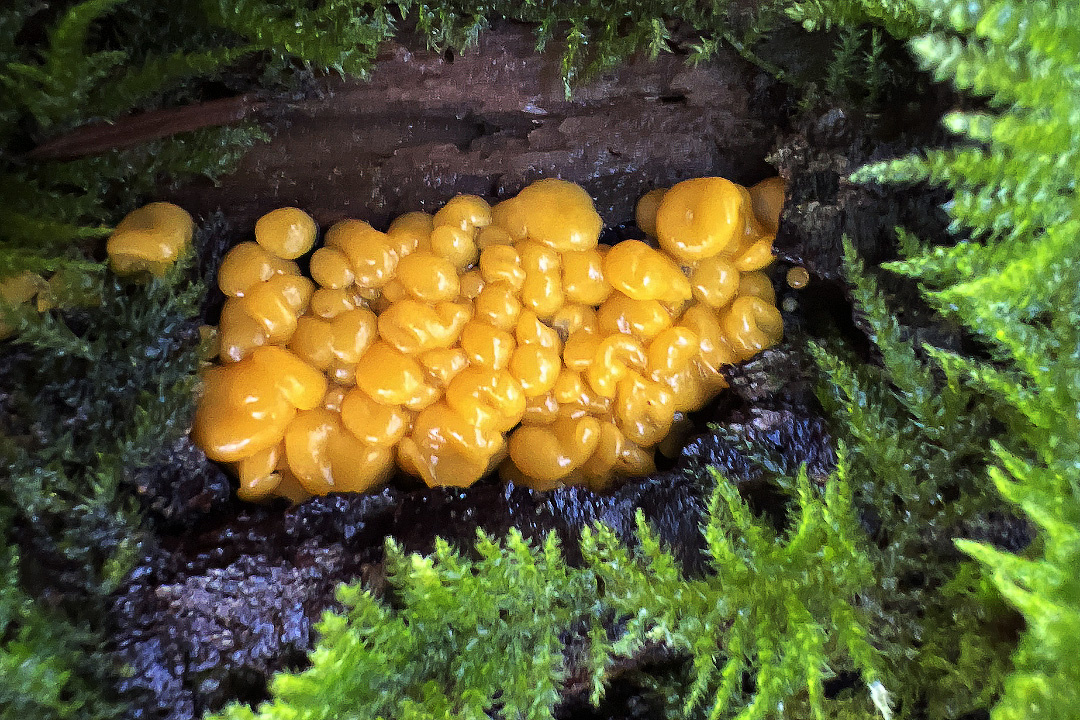 Привет, мои дорогие любители необычной земной природы, сегодня мы отправимся в лес, где тишина после дождя звенит каплями на ветках. И вот там, среди гниющих сучьев и влажного мха, вдруг вспыхивают жёлтые огоньки, будто кто-то рассыпал лимонные бусины прямо на коре. Вы идёте дальше, и лес вновь тонет в привычной серо-бурой палитре. Но эти крошечные искры не дают отвести взгляд. Кажется, что кто-то нарочно подсветил дорогу. И то, что перед вами блестит на коре, — не фонарики сказочного народца, а крошечные плодовые тела гриба. Перед вами калицина лимонная (Calycina citrina), которую раньше называли биспореллой лимонной (Bisporella citrina). Таксономия переменчива, но сам гриб от этого не перестал быть маленьким солнечным чудом, спрятанным в лесной глуши. Его ареал охватывает почти весь земной шар: этот гриб встречается на всех материках, кроме Антарктиды. Чаще всего он поселяется на гниющей древесине лиственных деревьев, но может облюбовать и хвойные. Влажные места, где воздух насыщен т