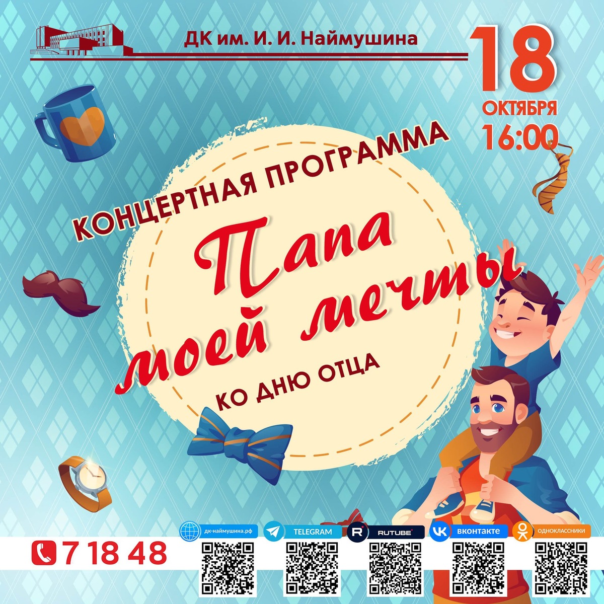 📅В календаре праздников современной России совсем недавно появилась дата – День отца. Папа — это целый мир: надежный друг, опора, наставник, защитник, пример для детей! Подарите папам свою любовь, радость, позитив и приятные моменты – пригласите на праздничный концерт «Папа моей мечты». Юные артисты всего города будут поздравлять пап во Дворце культуры имени И. И. Наймушина.✨ 📍Дата: 18 октября, 16:00 🎟Билеты в кассе ДК. ☎️Справки по телефону: 8 (39535) 7-18-48. 0+