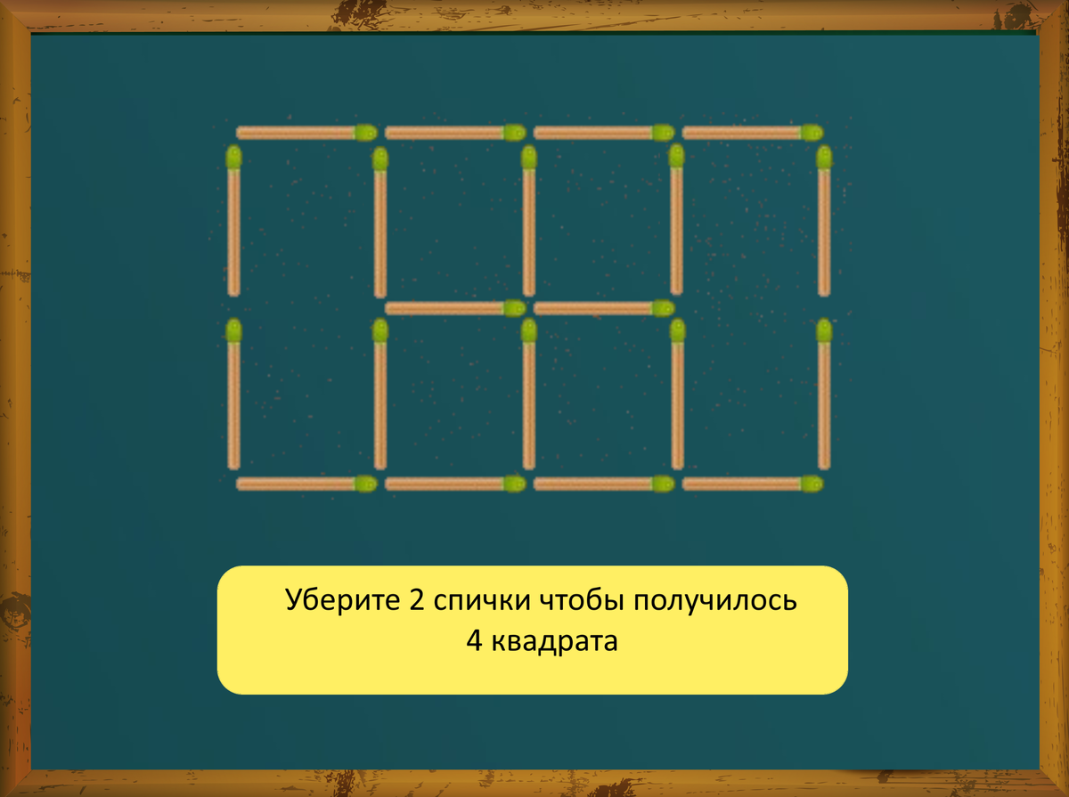 Сегодня для вас мы подготовили задание из раздела спички. Вам необходимо убрать всего лишь 2 спички чтобы получилось 4 квадрата.