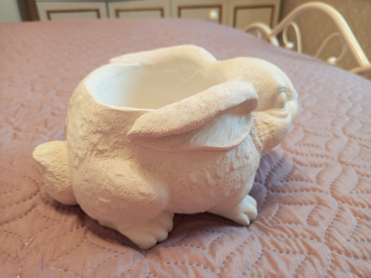 Здравствуйте, друзья!Наткнулась я сегодня на старую находку. Пару лет назад у подъезда, возле мусорного бака, выставили вот такие гипсовые кашпо. Было их много, десяток наверное, в основном побитые и расколотые. По-видимому, кто-то занимался их изготовлением, и что-то пошло не так. И в сердцах всё бросили и расколотили. По принципу: «Да не доставайся же ты никому». Ну мы , конечно же , не прошли мимо . Выбрали пять штук, почти целых. У одного лапка была отколота, это мелочь, нарастила новую, почти и незаметно. Что делать с пятью одинаковыми кашпо? Внуки наперебой, бабушка, а давай мы их тебе раскрасим !!! Отличная идея ! Устроили мастер-класс по раскрашиванию кроликов. Детей хлебом не корми , дай что - нибудь покрасить. Веселое получилось занятие . Молодцы ! Вот такое забавное семейство кроликов . Один прижился , стоит в уголке для хранения мелочей . А этот остался не у дел. Сегодня и до него очередь дошла, применю его по назначению . Я конечно не художник , но попытаюсь раскрасить. Уш
