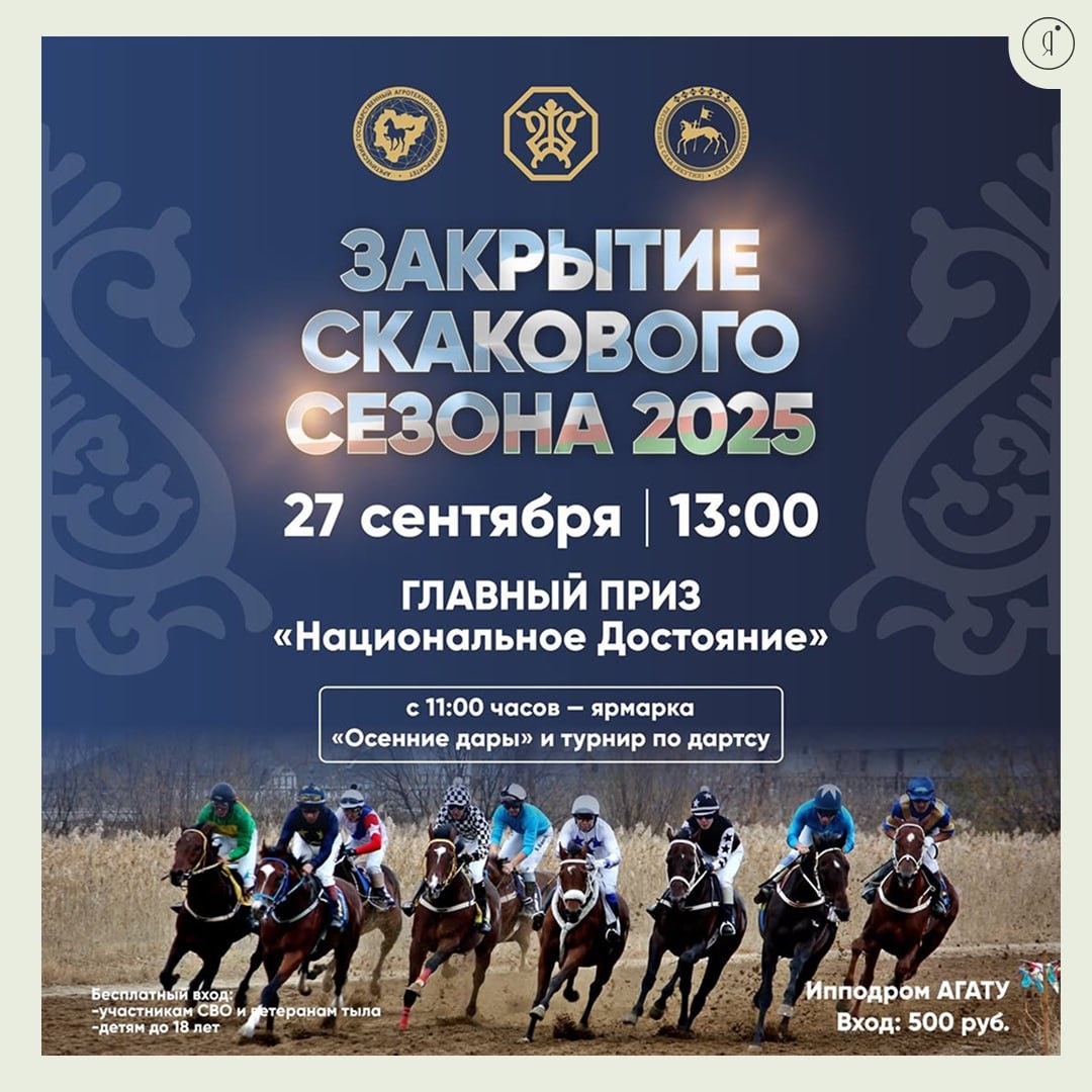 Закрытие сезона скачек #ВГороде 🤩 Вас ждут шесть захватывающих скачек на лошадях чистокровной верховой породы с общим призовым фондом 5 400 000 рублей. Программа мероприятия: С 11:00 часов работает ярмарка «Осенние дары» от Арктического ГАТУ , продажи товаров местных мастеров! В 13:00 — начало скаковой программы. На дорожке ипподрома — лучшие лошади и жокеи республики. 🤩Во время скачек — открытый турнир по дартсу среди женщин и мужчин. 27 сентября | 19:00 Ипподром АГАТУ Входной билет: 500 руб. Online Якутия | Подписаться