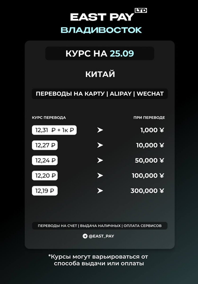 КУРСЫ НА КИТАЙ 💙Переводы на китайскую карту 💙Alipay / Wechat 🔘В течение дня курс может меняться. Рекомендуем уточнять актуальный курс у менеджера. ❗️ВАЖНО: мы получили лицензию и открыли офис в Корее. Подробности можете узнать у менеджера. 🔴🔴🔴🔴🔴🔴🔴🔴🔴🔴 🟠Написать менеджеру: @east_pay_world 🟠Сделать просчет самостоятельно в боте: @East_PaySer_bot ✈️ Подписаться на «East Pay»