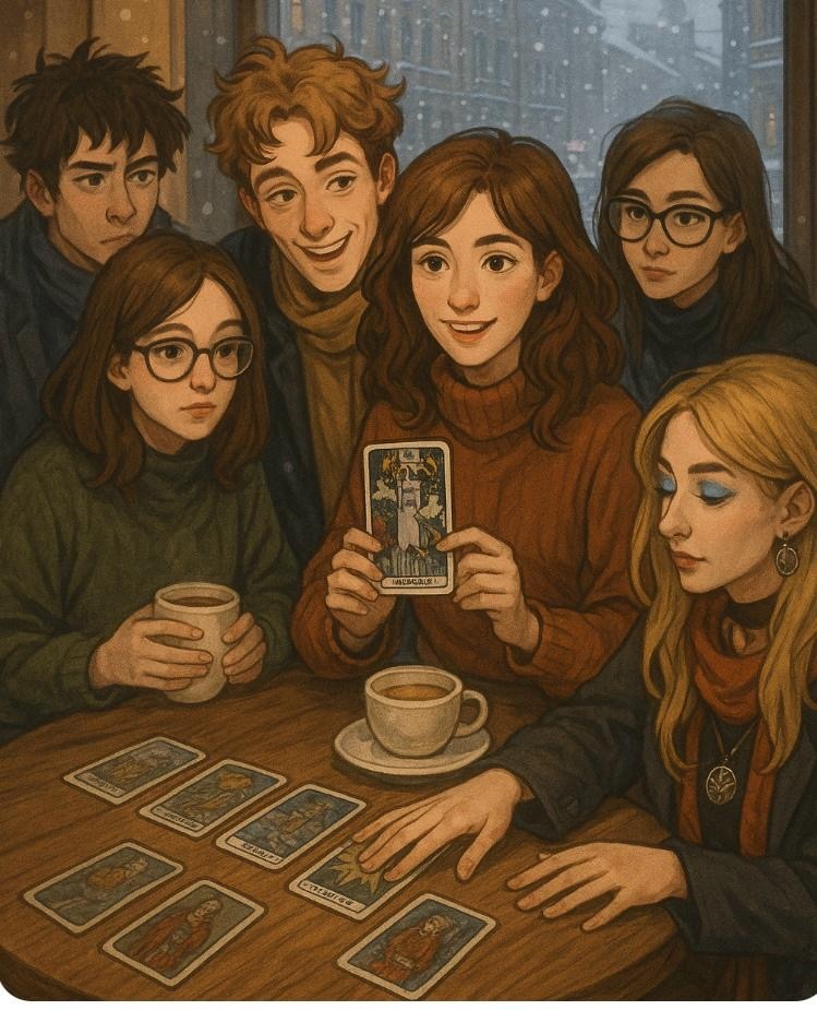 Глава 4. "Семь кружек кофе и одна карта" Мокрая питерская зима, как всегда, застала всех врасплох — особенно тех, кто утром вышел в лёгких куртках и теперь сушил рукава над батареями в университетской кофейне. Арина сидела за крайним столиком с видом на промокший двор. С каждой каплей на стекле ей казалось, что город шепчет: "Скоро. Скоро снова начнётся." — "Скучаешь по катастрофам?" — спросил внутри голос Мракобуса, но он был дома. Он всегда отказывался выходить в «места скопления студентов». Говорил, что у него аллергия на кофе с сиропом. Впрочем, она скучала. Не по катастрофам — по… ощущению. Когда реальность дрожит, как струна, и всё настоящее. — Эй, свободно? — рядом уже стоял Кирилл, весёлый, с торчащей макушкой и шарфом, будто позаимствованным у профессора философии. — Садись, — улыбнулась Арина. — Ты как всегда, с луной в глазах и шуткой наготове? — Ну конечно, — он скинул куртку и придвинулся. — Как экзамены? Жива или уже переселилась в Астрал? — Я, по-твоему, могу позволить