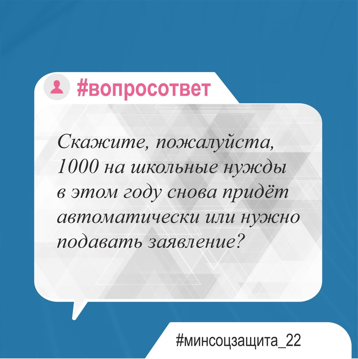 ❔Здравствуйте. Скажите, пожалуйста, 1000 на школьные нужды в этом году снова придёт автоматически или нужно подавать заявление? 💭 Здравствуйте. Если Вы получаете на 1 сентября 2025 года ежемесячное пособие в соцзащите ("маленькие детские") либо единое пособие в СФР на этого ребенка, и за прошлый 2024/2025 учебный год получали ежегодную выплату на школьные нужды на этого же ребенка, то выплата поступит беззаявительно не позднее 30 сентября 2025 года. 👉Если пособие не получаете или ребенок в этом году пошел в первый класс, то нужно обратиться с заявлением в МФЦ. 📍Напомним, выплата предоставляется семьям, если среднедушевой доход семьи не превышает установленную величину прожиточного минимума ( в 2025 году – 15 782 руб.), *Вопрос поступил через систему «Инцидент.Менеджмент» #Алтайскийкрай #Минсоцзащита_22 #Выплаташкольникам