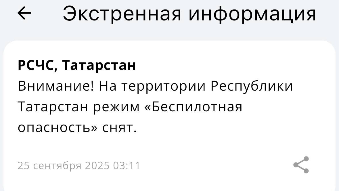В ответ на пост В Татарстане с 3 утра снят режим «Беспилотная опасность». 🌟 Татарстан News в MAX