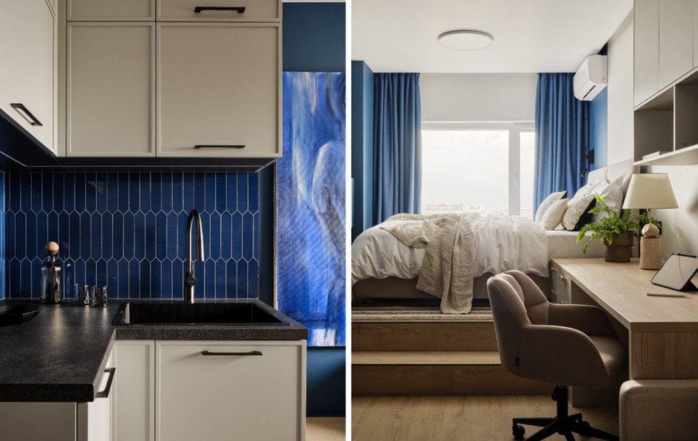 Главным акцентом стала плитка глубокого синего цвета в ванной комнате и на фартуке кухни. Также мы применили гипсовые светильники под покраску, создающие эффект «чистого» потолка без лишних элементов.