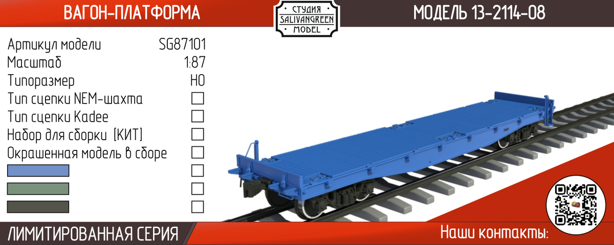 Новая линейка наборов от студии SalivanGreen позволяет создать модели платформ различных модификаций в различных вариантах окраски с различными номерами. Под серией артикулов SG87101 выпущены наборы, из которых можно собрать модели платформ 13-2114-08 трех разных транспортных компаний: ЕвроХим, Химинвесттранс, ФГК. Всего можно сделать восемь платформ с разными номерами: две платформы синего цвета компании Еврохим, две платформы зеленого цвета компании Химинвесттранс, четыре черные платформы компании ФГК.