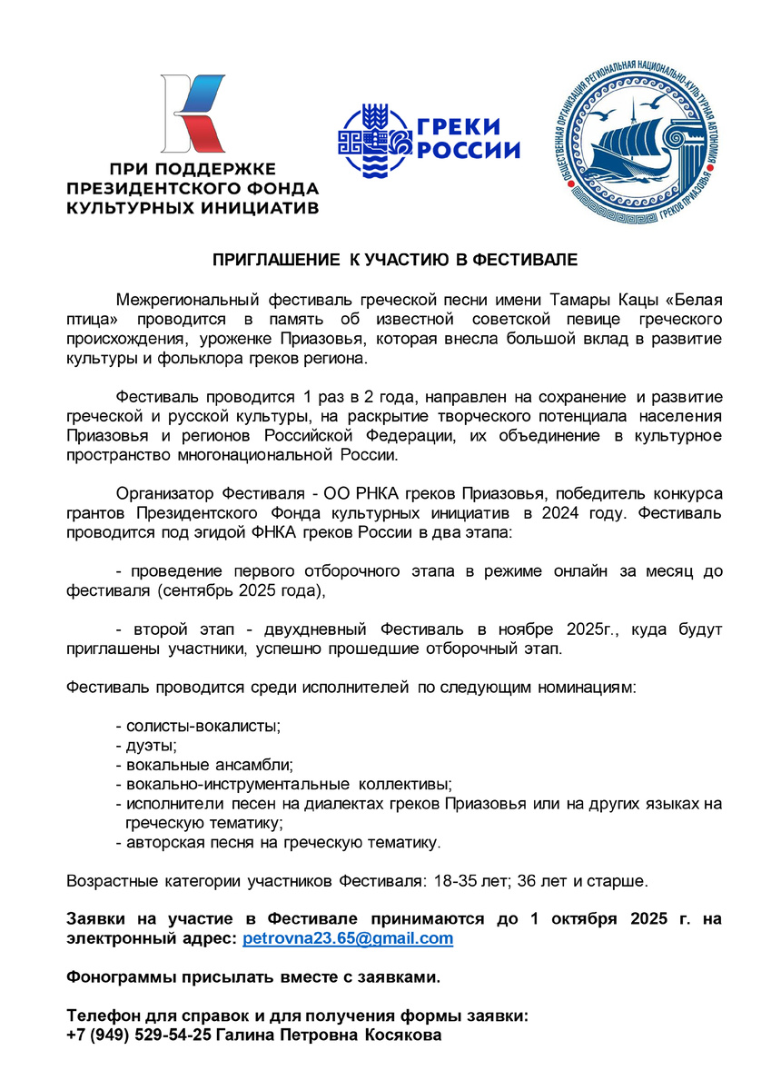 Дорогие друзья! Приглашаем вас в музыкальное путешествие, где переплетаются мелодии Эллады и голоса России! Межрегиональный фестиваль греческой песни имени Тамары Кацы «Белая птица» — это живая память о великой певице, это мост между культурами и твой шанс заявить о своём таланте! ✨ Почему «Белая птица»? Это символ вдохновения, чистоты и полёта души, который подарила нам Тамара Кацы. Мы продолжаем её дело — сохраняем и развиваем богатейшее культурное наследие греков России, объединяя голоса в одно большое творческое пространство. Как парит наша «Птица»? Два крыла фестиваля: 🦅 Онлайн-отбор (Сентябрь 2025) Станьте частью фестиваля из любой точки страны! Подайте заявку и пришлите своё видео-выступление. Это первый шаг к большой сцене! 🏛 Гала-концерт в Греческом стиле (Ноябрь 2025) Лучших из лучших мы пригласим на двухдневный праздник музыки и дружбы в греческий посёлок Сартана под Мариуполем! Яркие выступления, творческие встречи и незабываемая атмосфера ждут финалистов! Кого мы приглаш