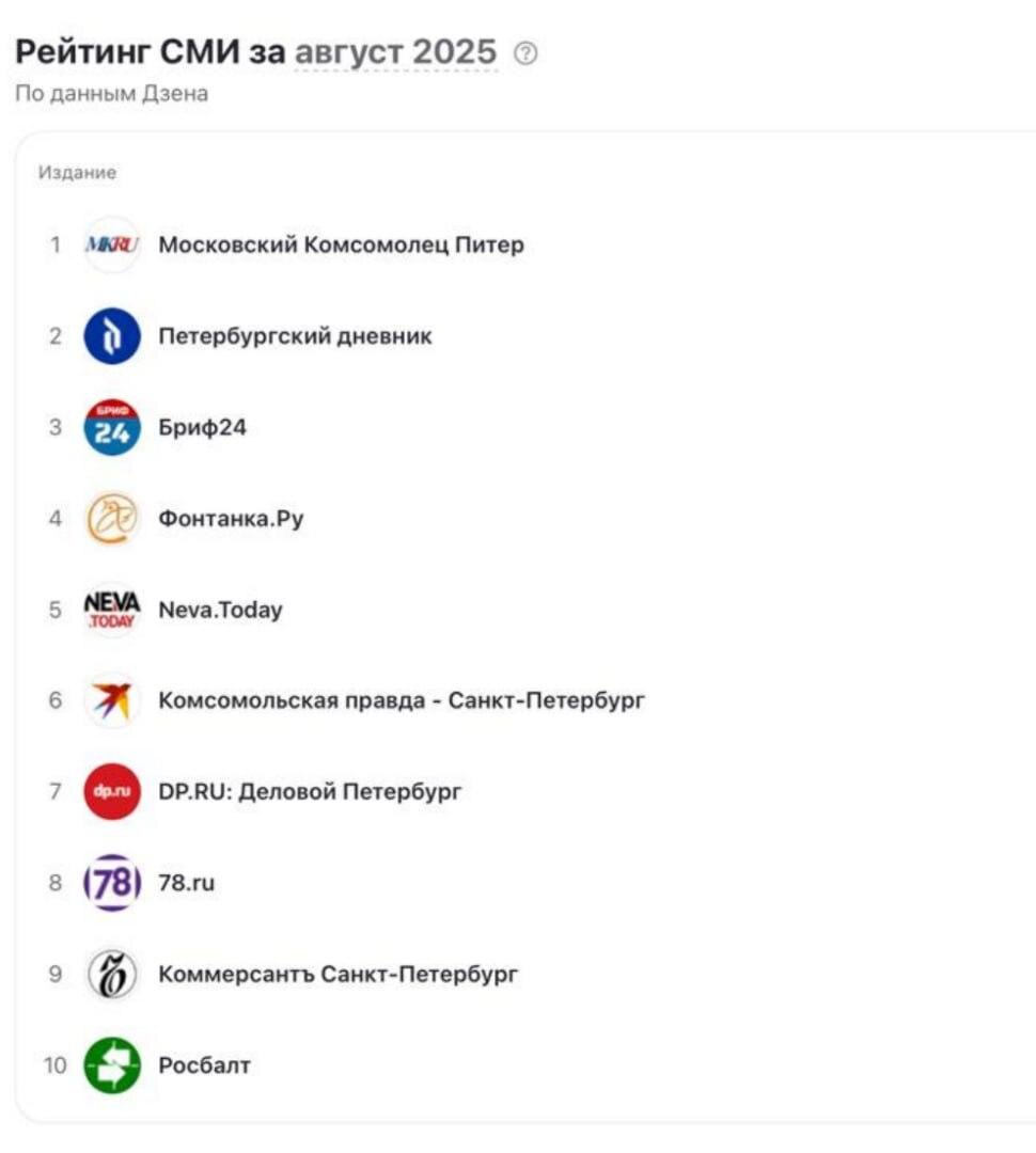 🏆 «Петербургский дневник» вошёл в тройку лидеров регионального рейтинга СМИ Дзен впервые опубликовал медиарейтинги региональных изданий за август по данным спецпроекта Mediascope. В основе рейтинга — цитируемость, число подписчиков и другие показатели. По итогам месяца в тройку лидеров вошли «МК в Питере», «Петербургский дневник» и «Бриф24». В общероссийском списке «Петербургский дневник» занял 32-е место. Фото: скриншот по данным Дзена Подписаться на Петербургский Дневник в MAX