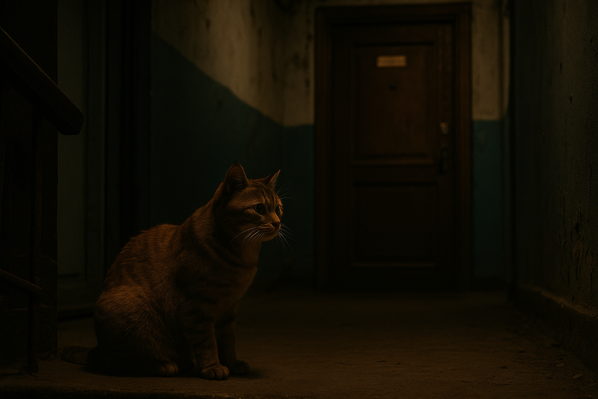 На третью ночь я решил проследить. Свет в подъезде выключился, как по расписанию. Кот вскочил. Подошёл к двери. Я молча встал, включил фонарик на телефоне, открыл — и пошёл следом.