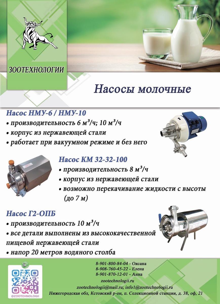 Представляем Вашему вниманию молочные насосы. Устройства, предназначенные для бесперебойного производства молочной продукции. С их помощью производится перекачивание и подъем продуктов в разных температурных диапазонах. У нас Вы можете выбрать из широкого ассортимента пищевых молочных центробежных насосов: Г2ОПБ, КМ-32-32-100, НМУ. Все вопросы Вы можете задать по телефонам: Елена Д.: 8-908-760-45-22 Оксана: 8-901-800-84-04 Анна: 8-901-870-12-01 Юлия: 8-908-742-37-86