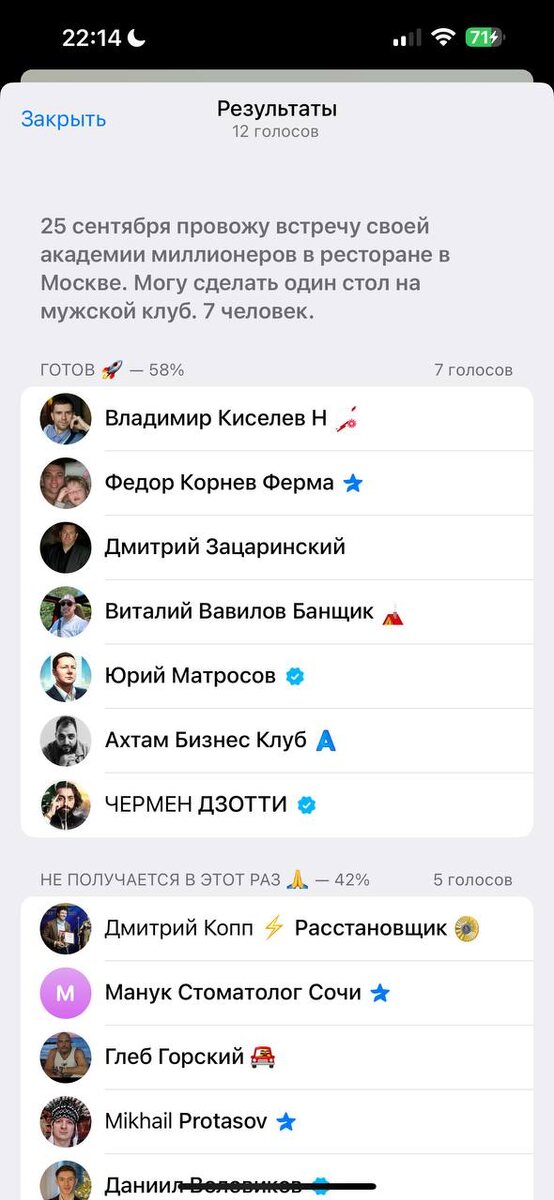 🗓 Программа оффлайн-встречи Академии Миллионеров 25 сентября 14:00 — Сбор гостей, регистрация, нетворкинг 15:00 — Выступление Вселены Мастер +ответы на вопросы 16:00 — Начало встречи. Выступление Чермена Дзотти + ответы на вопросы 17:00 — Мастер-майнды, нетворкинг 19:00 — Завершение встречи Адрес Casa Agave Гастрономический мексиканский ресторан в центре Москвы г. Москва, Большой Черкасский, пер. 15/17, строение 1 https://yandex.ru/maps/213/moscow/house/bolshoy_cherkasskiy_pereulok_15_17/Z04YcAVnTEcBQFtvfXt0d35hYA==/