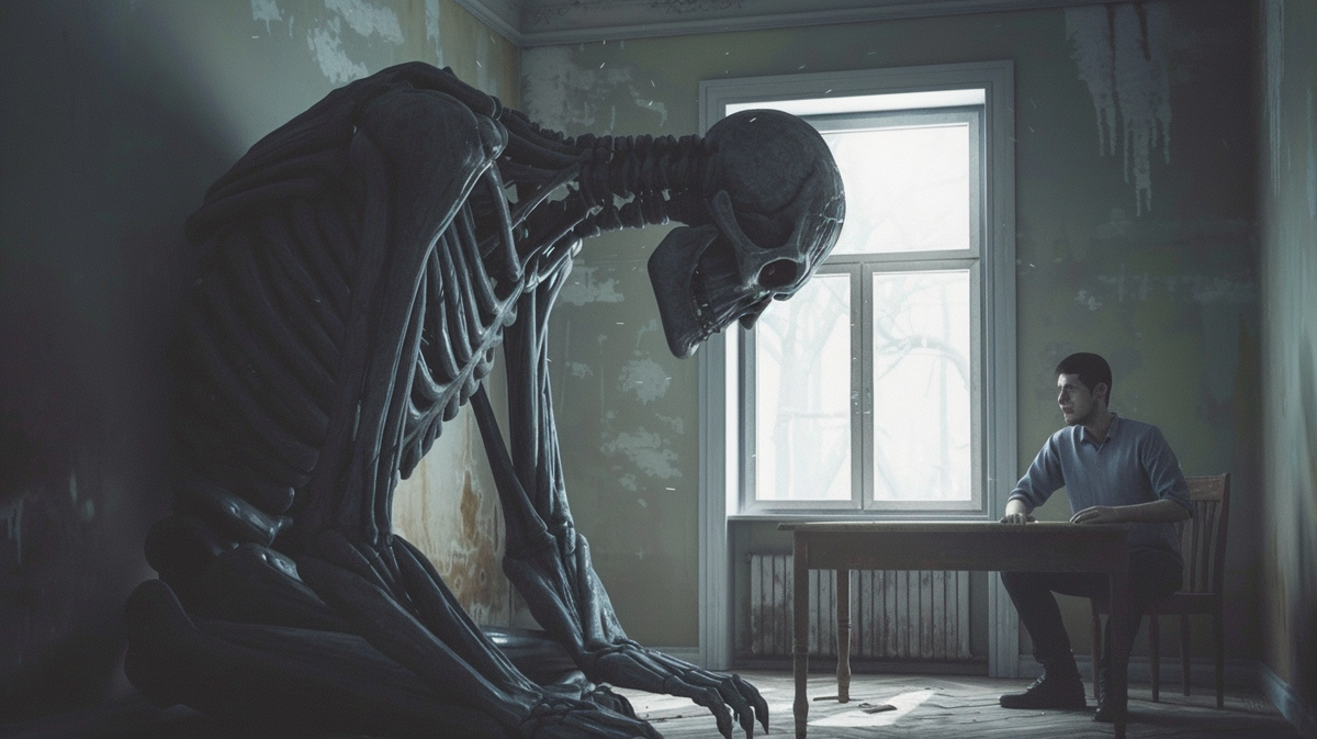 Он был высоким. Неправдоподобно высоким и худым, как скелет, обтянутый сухой, тёмной кожей, потрескавшейся, как старая древесина. На нём была старая, выцветшая рубаха. Лица я не мог разглядеть, оно тонуло в тени. Но я видел его руки. Они свисали почти до самого пола. Длинные, как ветви старого дерева, с тонкими, узловатыми пальцами.