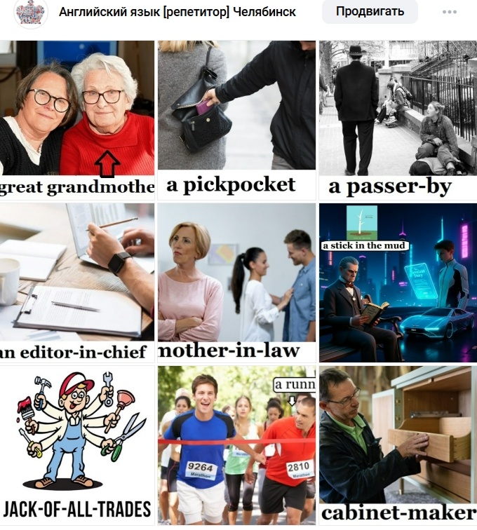 Warm up for 7-8 grades. People and Idioms. British Bulldog Разминка для 7-8 классов. Олимпиада British Bulldog. 1. Сначала прочитали/послушали описание каждой карточки (прикрепляю в комментариях descriptions): a great grandmother, a pickpocket, a passer-by, an editor-in-chief, mother-in-law, a stick in the mud, a Jack-off-all-trades, a runner-by, a cabinet-maker. 2. Потом делаем тест, см. в комментарии. Flashcards, definitions, test are available in VK group Королевство английского языка Карточки, описание и тест доступны в группе в Вконтакте Королевство английского языка