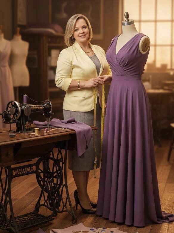 Нейронка отлично понимает русский язык. 📸Загружаю любое свое фото. ✏️Пишу промп: гиперреализм, деталлизированное изображение на котором загруженный пользователь держит в руках сантиметр как портной, стоит возле маникена в вечернем сиреневом платье по размеру пользователя, на полу разбросаны отрезы ткани, катушки ниток, пуговицы, на столе швейная машина, что создает атмосферу швейной мастерской, теплый ламповый свет, стилистика 40-х годов 20 века, загруженный Пользователь смотрит в камеру, черты лица не меняй.