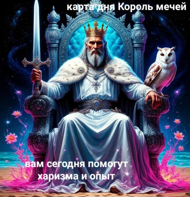 Карта дня Король мечей Это день принятия важных решений. Для кого-то, это сложный и напряжённый день, кому решения даются не легко. А кто-то в такие дни чувствует себя, как рыба в воде Вам может понадобится умение размышлять, быстро принимать решения и сразу действовать. Кто-то возможно в такой день встретит человека мудрого, который станет его наставником и хорошим другом.