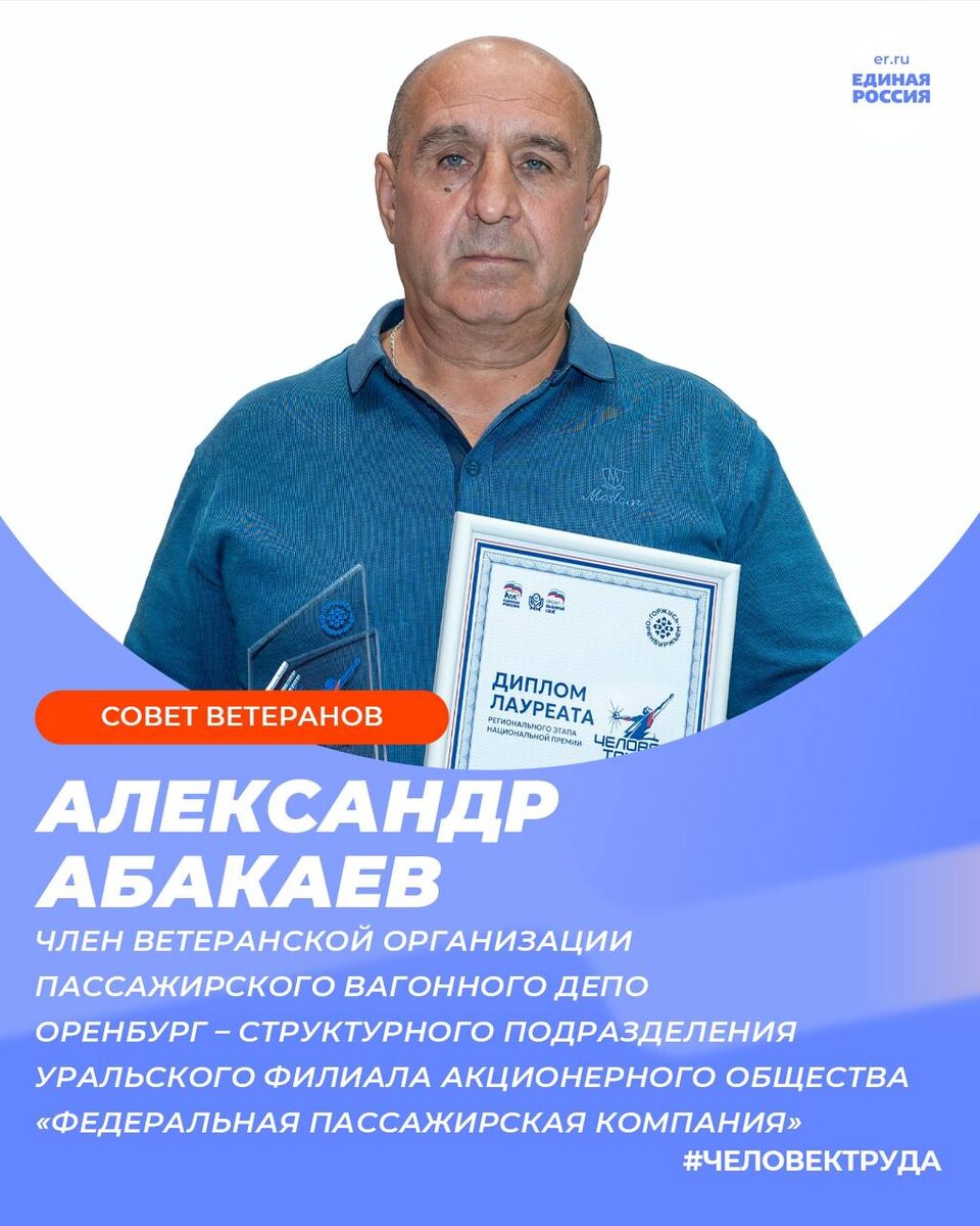 🔹Лауреатом регионального этапа Премии «Человек труда» в номинации «Совет ветеранов» стал Александр Абакаев – член ветеранской организации Пассажирского вагонного депо Оренбург – структурного подразделения Уральского филиала акционерного общества «Федеральная пассажирская компания».
