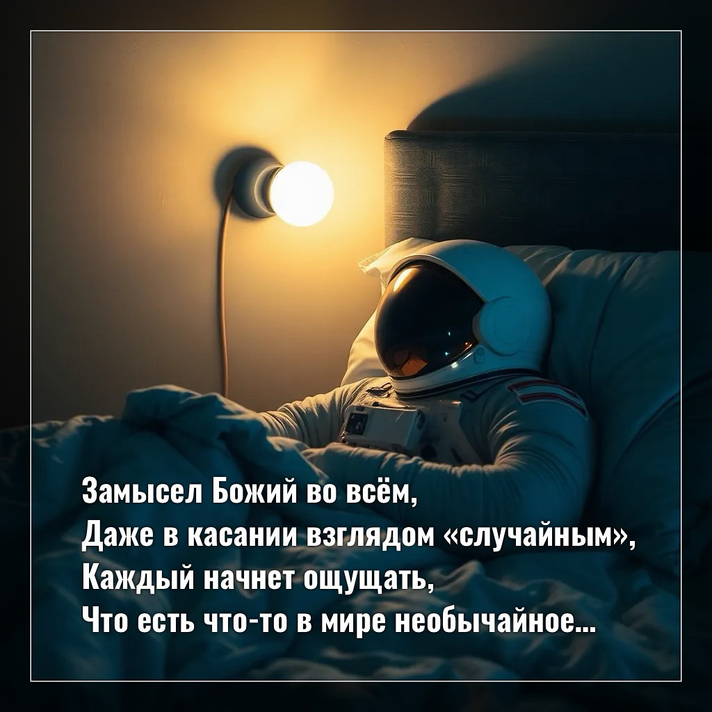 Замысел Божий во всём, Даже в касании взглядом «случайным», Каждый начнет ощущать, Что есть что-то в мире необычайное, Что нас заставляет идти, Даже когда уже нету сил встать, А кто-то Домой возвращается, Хотя собирался лечь просто спать И строил планы на завтра, А завтра «случайно» не наступило, Кто-то нашёл смысл жизни И в тот же момент болезнь отступила, Так разнообразен наш мир И жизнь неподвластна каким-то законам, Нельзя себя в чем-то винить, Сдаваться нельзя, начинать нужно снова, Пока на Земле этот путь Ещё продолжается и Бог здесь ведёт, Ты знаешь, так время летит, Что кажется в миг жизнь любого пройдёт. От этого страшно кому-то, А кто-то совсем не знает про смерть, Он думает - это конец, А это шанс Богу в глаза посмотреть, Вот так и пройдет день за днём, Мы даже подсказок Небес не заметим, Но даже в текущих словах, Бог каждого сердцем своим «метит», Теплом разольётся внутри Забота его, красота и признание, Что всё для тебя в «первый раз», А Он это чётко видел заранее.