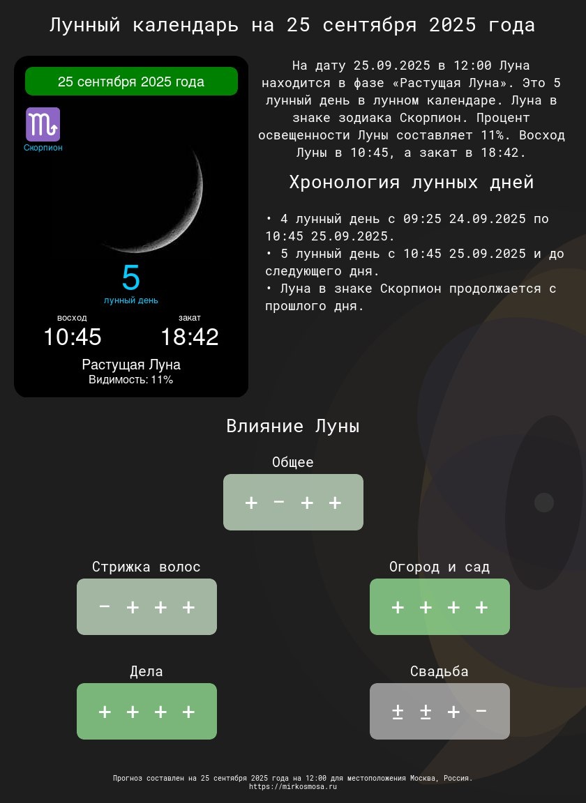 Лунные календари на 25 сентября 2025 года: Подготовьтесь к этому дню с учетом влияния Луны! 🔹🌗 Лунный календарь на 25 сентября 2025 года — Что приготовила Луна? Подробнее 🔹✂️ Лунный календарь стрижек на 25 сентября 2025 года — Подходящий ли день для обновления прически? Подробнее 🔹🌱 Лунный календарь огородника и садовода на 25 сентября 2025 года — Лучшее время для ухода за растениями. Подробнее 🔹📅 Лунный календарь дел на 25 сентября 2025 года — Удачные моменты для важных задач. Подробнее 🔹💍 Лунный календарь свадеб на 25 сентября 2025 года — Подходит ли этот день для вашего торжества? Подробнее