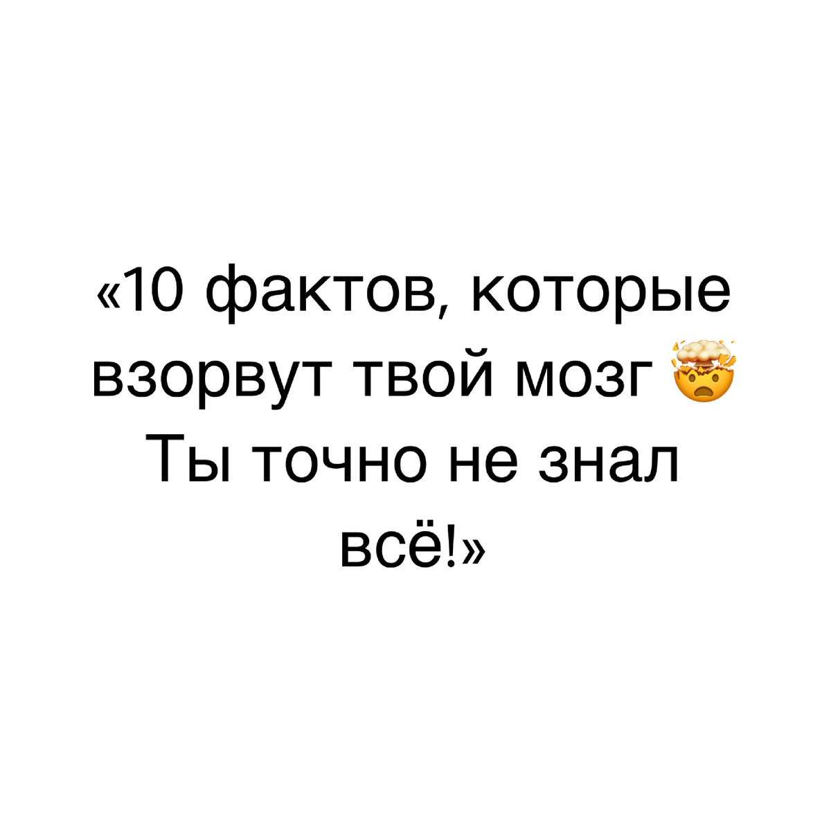«10 фактов, которые взорвут твой мозг 🤯 Ты точно не знал всё!» 10 интересных фактов, о которых мало кто знает 🤯 Мы привыкли к привычным вещам вокруг, но мир полон неожиданностей. Вот 10 фактов, которые могут удивить даже самых любопытных. 1. Самая короткая война в истории В 1896 году Британия и Занзибар воевали всего… 38 минут. После этого Занзибар сдался. 2. Бананы — это ягоды А вот клубника, которую мы считаем ягодой, на самом деле к ним не относится. 3. В Антарктиде есть только один вид насекомых Это крошечная мошка Belgica antarctica — и она единственная, кто выжил в таких условиях. 4. Мёд не портится Учёные находили запасы мёда в египетских гробницах, которым больше 3 000 лет — и он был съедобным. 5. Пингвины дарят камешки Чтобы завоевать самку, пингвин приносит ей красивый камешек. Это у них как кольцо у людей. 6. Октопусы имеют три сердца Два гоняют кровь через жабры, а одно — по телу. И когда они плавают, «главное» сердце перестаёт биться. 7. В Японии есть кафе с с