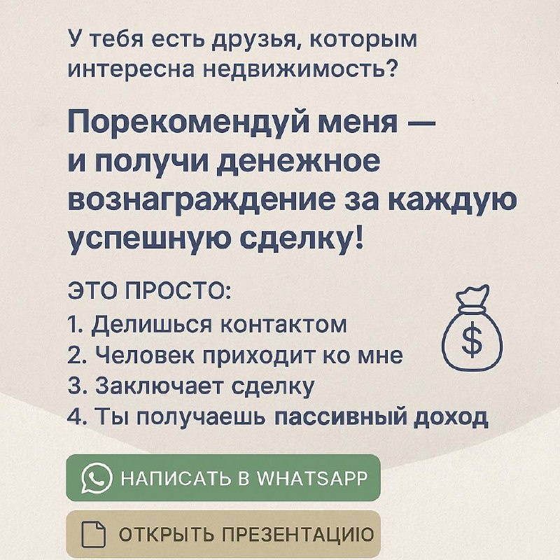 💼 РЕКОМЕНДУЙ И ЗАРАБАТЫВАЙ 🔗 У тебя есть друзья, которым интересна недвижимость? Порекомендуй меня — и получи денежное вознаграждение за каждую успешную сделку! 👩🎓 Это просто: 1. Делишься контактом 2. Человек приходит ко мне 3. Заключает сделку 4. Ты получаешь пассивный доход 📲 Узнать подробности: 👉 написать в WhatsApp https://wa.me/message/XHNO3BVEWMTSD1 📎 Презентация условий: 🔗 Открыть презентацию https://docs.google.com/presentation/d/1FLtdOALsDBLNgrJGJgcV1Gh9BbFugV5jwfoseNjFiGI/edit?usp=sharing 💬 Рекомендация с душой — доход с умом.