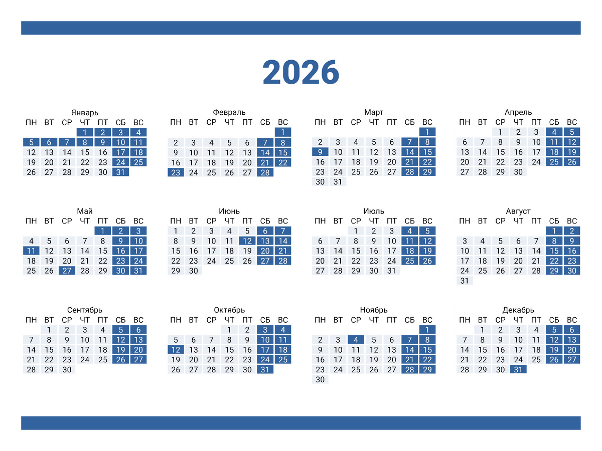 Правительство РФ утвердило произдводственный календарь на 2026 год Без малого месяц – 27 дней - предстоящего года приходится на праздничные дни отдыха, это не считая выходных. Если приплюсовать субботы и воскресенья, то нерабочим будет 121 день – это уже почти четыре месяца! По сообщению пресс-службы правительства РФ, новогодние каникулы начнутся с 31 декабря и продлятся до 11 января – всего 12 дней. Если запланировать дальнюю поездку, отдых можно продлить до 16 дней. Для этого нужно будет использовать всего два дня оплачиваемого отпуска или взять отпуск без содержания, оформив их на 29 и 30 декабря и начать отдыхать «по-новогоднему» уже в субботу, с 27 декабря. Почти все праздничные дни 2026 года приходятся на конец или начало недели, т.е. перед выходными или после них, поэтому трехдневных выходных у нас будет много: с 21 по 23 февраля – День защитника Отечества, с 7 по 9 марта – Международный женский день, с 1 по 3 мая – Праздник весны и труда, с 9 по 11 мая – День Победы, с 12 по 1
