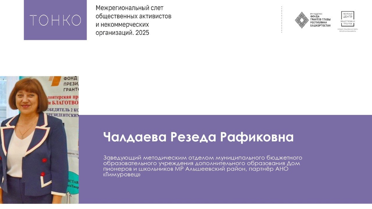 #ТОНКО #ФПГ Заведующий методическим отделом Дома пионеров и школьников Альшеевского района Резеда Чалдаева на межрегиональном слете активистов и НКО "ТОНКО" рассказала про проекты, которые реализованы в разные года при поддержке президентских грантов АНО "Тимуровец". 1. Проект «Блажен, кто предков с чистым сердцем чтит», 2023 г. В рамках проекта проводились уроки памяти, краеведческие чтения и экскурсии, творческие конкурсы, торжественное открытие мемориальной доски Раеву А.Ф. на вокзале железнодорожной станции Раевка, празднование 200-летия Раева А.Ф. 2. Проект «Волонтёрская профильная смена «СВОи БЛАГОТВОРИТЕЛИ», 2024 г. В рамках смены проводились собрания с вожатыми-волонтерами, образовательный практикум «Волонтёрство и благотворительность», творческие мастерские по изготовлению талисманов добра, армейского сухого душа, окопных свечей, акции «письма солдату», конкурс «смотр песни и строя», краеведческие экскурсии «Раевка историческая – живая память», игра «зарница», фестиваль «