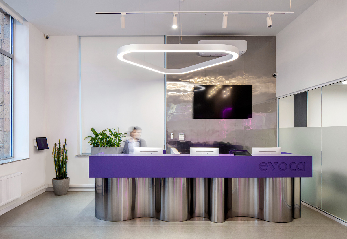 Проект для Evocabank стал воплощением динамики и инноваций. Команда Futuris Architects создала пространство, которое соединяет функциональность банковского офиса с эмоциональной силой бренда. Интерьер задаёт новое представление о том, каким может быть современный банк. Фирменный фиолетовый стал основой визуальной концепции. В сочетании с белыми поверхностями и зеркальными элементами он создаёт ощущение энергии и технологичности. Линейная подсветка формирует движение, подчеркивает геометрию стен и превращает пространство в динамичную среду. Ресепшн выполнен в минималистичной манере с акцентом на фиолетовую стойку и хромированные панели. Сочетание материалов демонстрирует философию открытости и прозрачности, которая важна для бренда. Светильники с плавной геометрией создают атмосферу современного технологичного сервиса. Рабочие зоны спроектированы так, чтобы каждая деталь способствовала комфорту. Живые растения встроены в перегородки и добавляют ощущение уюта. Подсветка столов и мебели п