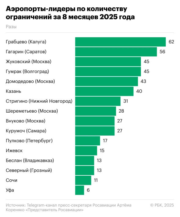Ижевский аэропорт 15 раз ограничивал полеты с начала года из-за беспилотной опасности РБК проанализировал, в каких аэропортах страны чаще всего вводились ограничения из-за угрозы атаки беспилотников. Аэропорт Ижевска 15 раз ограничивал свою работу из-за беспилотной опасности за первые 8 месяцев 2025 года (12 место в стране по количеству ограничений). Примерно столько же (17 раз) ограничивали свою работу петербургский аэропорт Пулково. В лидерах по ограничениям аэропорт Грабцево (Калуга), Гагарин (Саратов), Жуковский (Москва). В общей сложности с января по август 2025 года ограничения в российских аэропортах вводили 479 раз. Фото: РБК Подписывайся на Ижевский бизON #Ижевск