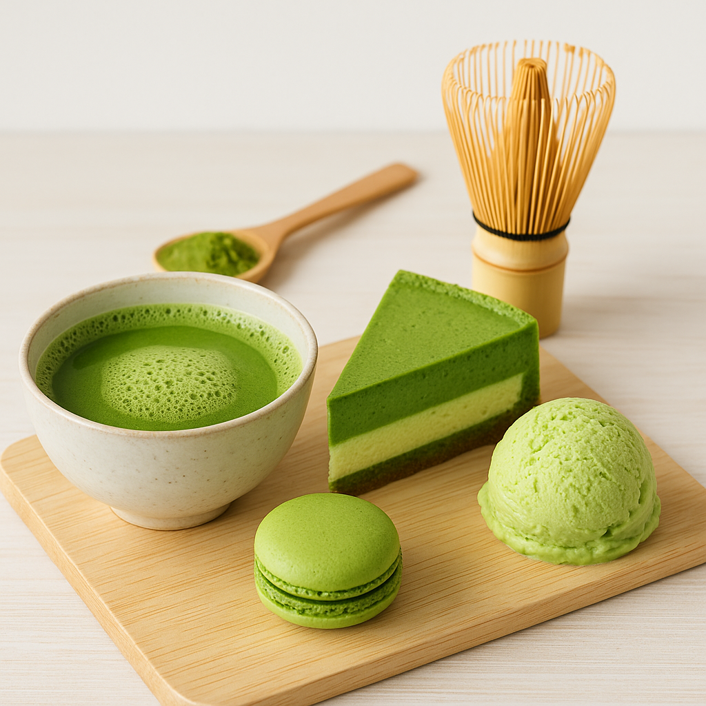 - Десерты — матча добавляется в мороженое, чизкейки, макаруны, бисквиты, пирожные и торты. Она придаёт им необычный травянисто-ореховый вкус и характерный зелёный оттенок.