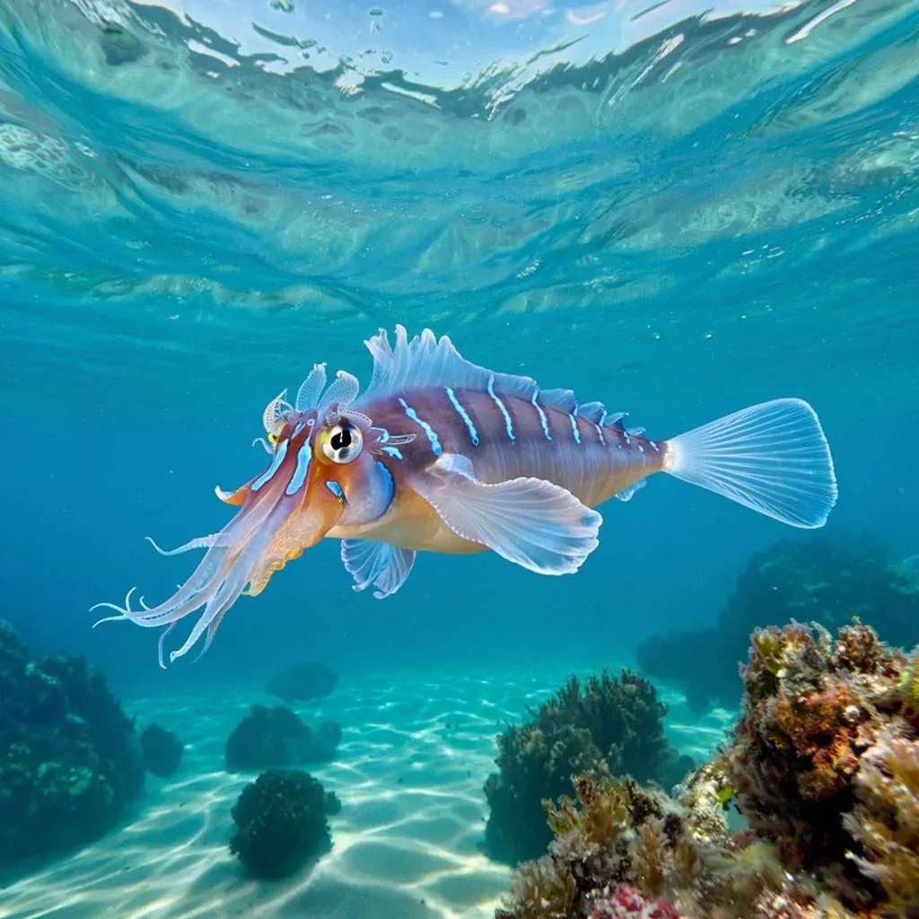 Вдалеке слышится мягкий шум океанских волн, лениво набегающих на берег и отступающих обратно, создавая гармонию спокойствия и безмятежности. Поверхность воды отражает все оттенки синевы – от глубокого индиго до светло-голубой лазури. Солнечные лучи пробиваются через прозрачную воду, превращая её поверхность в калейдоскоп золотых бликов и ярких вспышек света. Среди этого живописного пейзажа можно заметить маленькое существо, похожее на фантастическое творение мастера-иллюстратора. Это знаменитый Glaucus atlanticus, которого называют "голубым драконом" или "морским слизнем". Он представляет собой невероятный образец природной эстетики и биологической инженерии. Его тельце длиной около двух-трёх сантиметров напоминает произведение искусства, выполненное из тонких нитей стекла и драгоценных камней. Оно полупрозрачное с мягким сиянием цвета сапфира, благодаря которому существо практически растворяется в окружающей среде. Вытянутые боковые лопасти напоминают небольшие крылья бабочки, укра