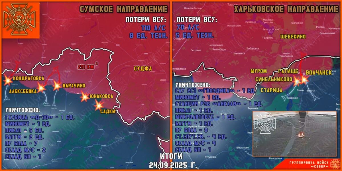 К утру 25 сентября от группировки войск «Север» поступила новая информация о боевых действиях в Харьковской и Сумской областях, в том числе у подступах к курскому приграничью.