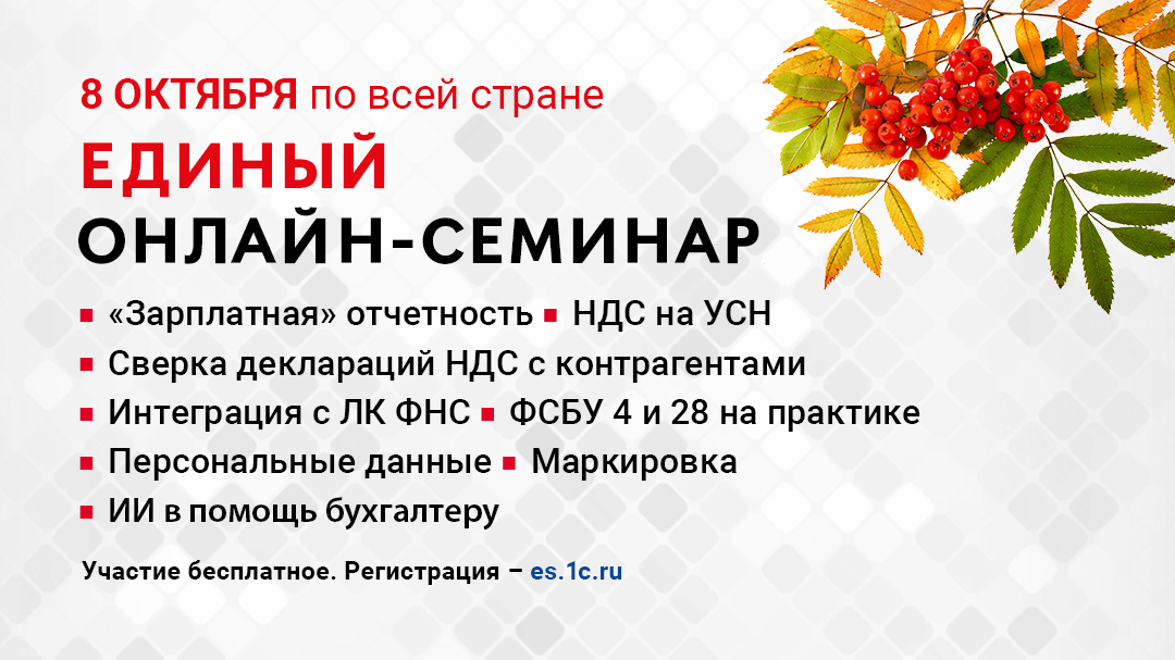 Так что прямо сейчас, пока есть минутка — регистрируйтесь на Единый онлайн-семинар 1С. Бесплатно, 08.10.2025 года.
