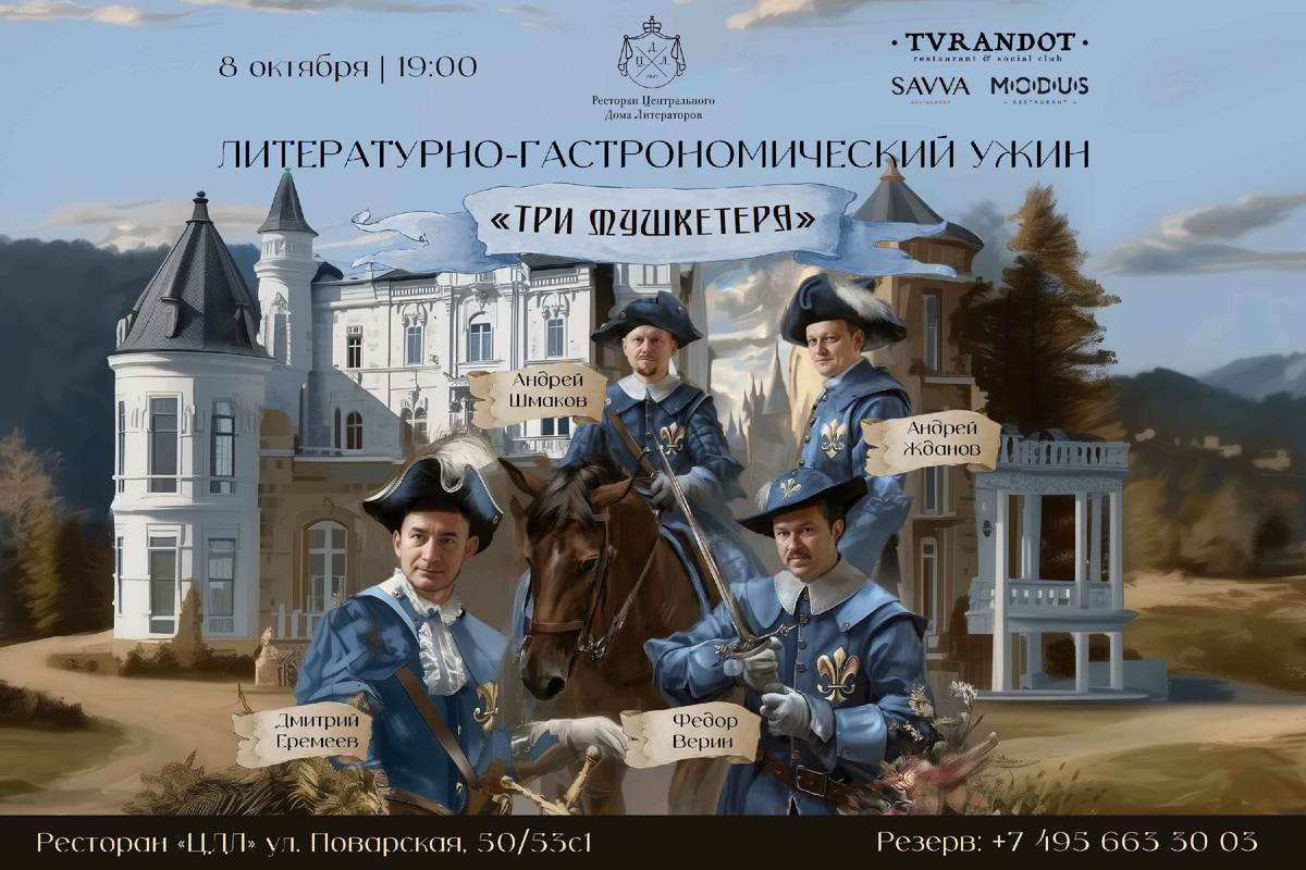 8 октября состоится уникальный ужин, вдохновленный путешествиями и произведениями Александра Дюма, в частности, его знаменитым романом "Три мушкетера". В ЦДЛ соберутся известные шеф-повара ведущих российских ресторанов, чтобы воссоздать атмосферу эпохи Дюма. В этот вечер бренд-шеф ЦДЛ Федор Верин примет своих коллег: Дмитрия Еремеева (ресторан «Турандот»), Андрея Жданова (ресторан «Modus») и Андрея Шмакова (ресторан «Savva»).