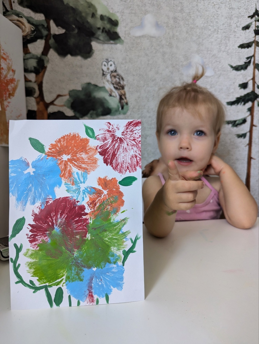 Опробовали супер-простой и эффектный способ рисования. Юной художнице безумно понравилось пришлёпывать цветочки.