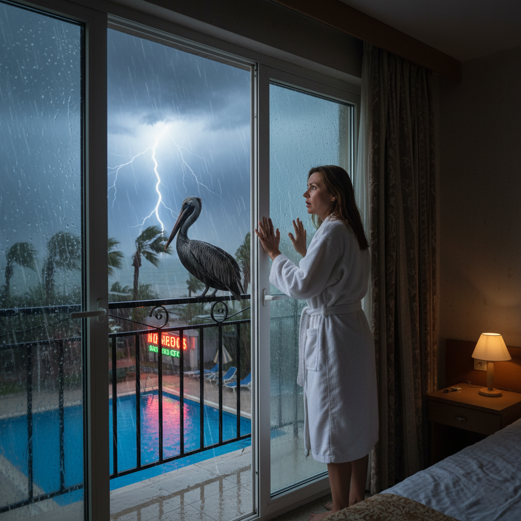 Она открыла штору и увидела… пеликана. Настоящего, большого, мокрого, слегка потрёпанного жизнью. Он сидел на перилах балкона, сжал лапы, втянул голову и выглядел так, будто забронировал номер по акции «неожиданные гости». Посмотрел на Лену и стукнул клювом в стекло ещё раз, как воспитанный посетитель: «Мадемуазель, пустите обсушиться».