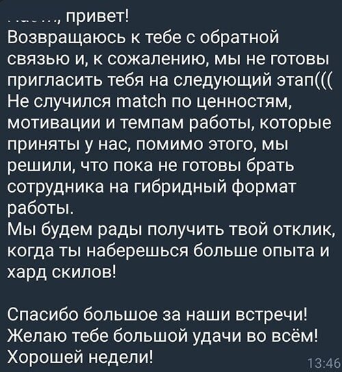 Не могу не поделиться антипримером рекрутерской работы - сообщением об отказе в найме, направленным в чате Телеграм. Шокировало содержание сообщения, в котором рекрутер бесцеремонно обращается к соискателю на "ты" и уверенно заявляет об полном отсутствии у последнего каких-либо личных и деловых качеств, которые могли бы заинтересовать компанию - "ценностей, мотивации, темпов работы, опыта и хард скилов". Особо впечатляет лексика "HR специалиста", использующего в деловой переписке сленг посетителей сайтов знакомств - "не случился match". Интересно, что у получателя этого сообщения всё было хорошо и с опытом, и с хард скилами, над фразой про не случившийся match по ценностям, мотивации и темпам работы он посмеялся, понимая её бессмысленность. И хотя отказ в такой экзотической форме удивил и повеселил и его, и коллег, было все-таки обидно и неприятно - не так часто после переговоров о найме тебе безапелляционно сообщают, что ты во всём никакой, и с тобой вообще "не случился match", в пере