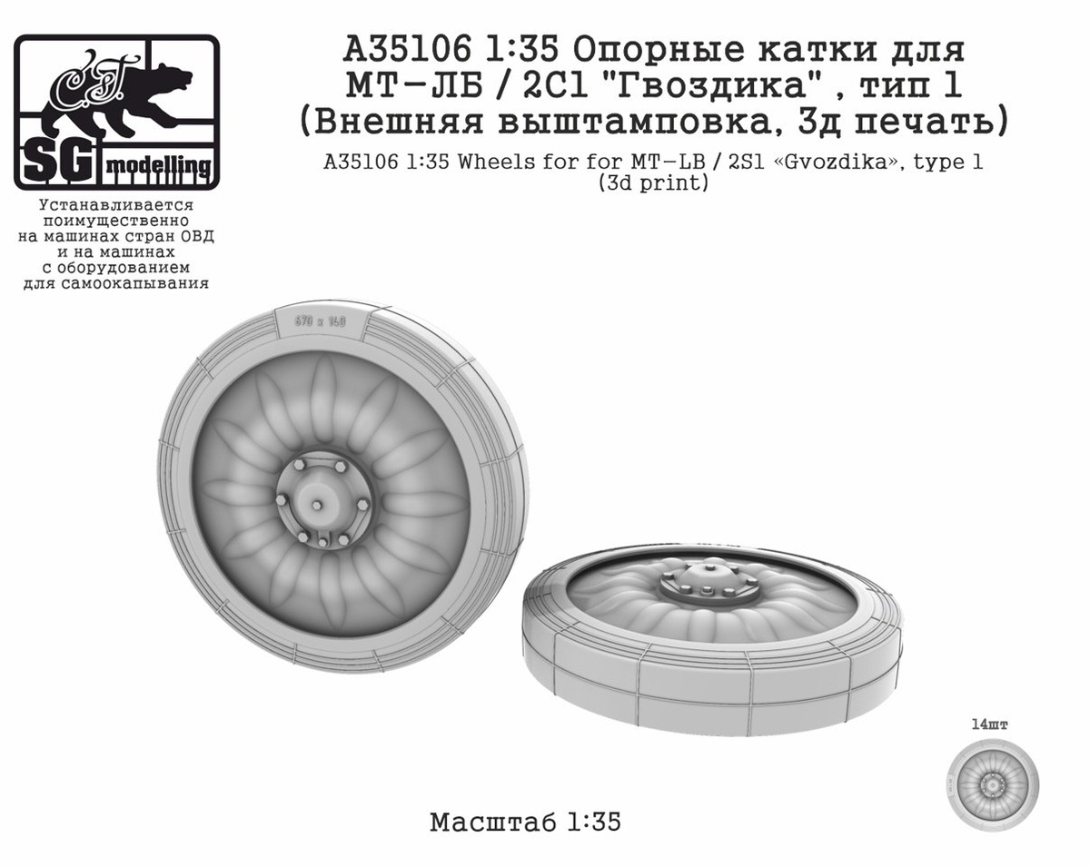Нижнетагильская SG-MODELLING выпустила на 3D-принтере наборы опорных катков для моделей МТ-ЛБ и САУ "Гвоздика" в масштабе 1/35: A35106 Опорные катки для МТ-ЛБ / 2С1 "Гвоздика" , тип 1 A35107 Опорные катки для МТ-ЛБ / 2С1 "Гвоздика" , тип 2