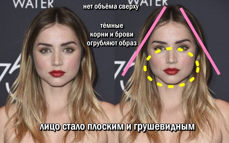Многие не верят, что Ана де Армас 1988 года рождения, то есть, близится к сорокалетию. Ведь выглядит она невероятно молодо за счёт своего бэйбифейса – круглого миловидного лица с пухлыми щеками. Но и его надо правильно декорировать причёской, а это не всегда удаётся стилистам. Смотрим на причёски, которые портят красоту кубинской голливудчанки Аны де Армас. Круглому или грушевидному лицу с тяжёлыми щеками категорически не подходят ни такие простые укладки на прямой пробор, ни окрашивание омбре с тёмными корнями. Объём сверху совсем теряется, всё внимание идёт вниз, что визуально ещё больше утяжеляет и округляет лицо. А у Аны ещё и странный макияж подкачал – он сделал лицо не только большим и круглым, но ещё и плоским. Обладательницам круглых лиц часто рекомендуют делать такие стрижки с густой чёлкой. Но проблема в том, что чёлка, которая опирается с скулы, «съедает» верхнюю часть лица, укорачивая его. В результате ширина лица только подчёркивается, и оно выглядит ещё более массивным. Э
