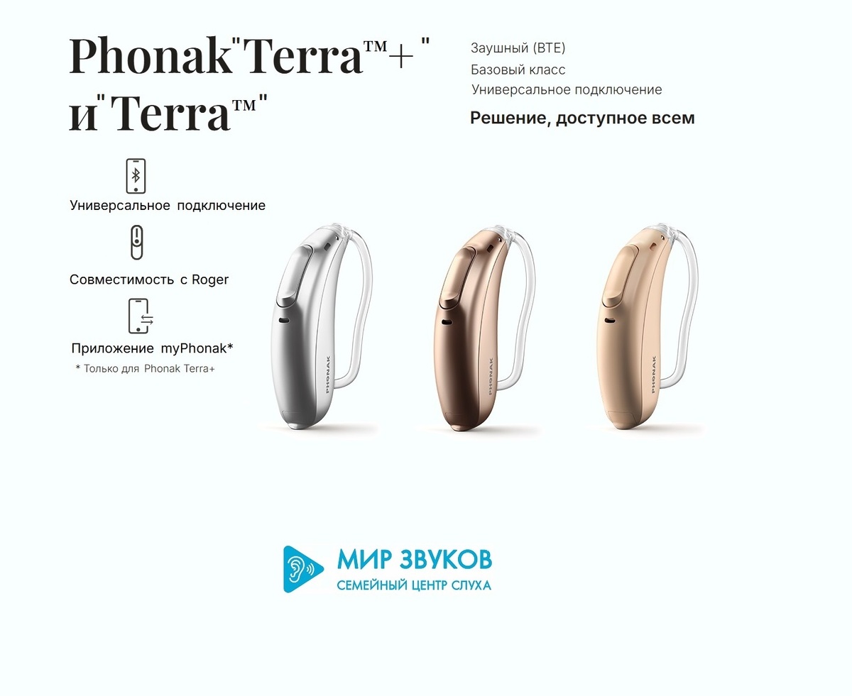 Решение проблемы тугоухости доступное каждому! В семейном центре слуха "Мир Звуков" слуховые аппараты в наличии от 8500 рублей. ▌ PHONAK Terra+ и Terra BTE: Революционный прорыв в мире слуховых технологий, по доступной цене. В современном обществе проблемы со слухом становятся всё более распространёнными, особенно среди пожилых людей и лиц с хроническими заболеваниями уха. Компания PHONAK, известный производитель высококачественных слуховых устройств, недавно представила новую линейку продуктов — Terra+ и Terra BTE, которые обещают революционизировать отрасль слухопротезирования. ▌ Что такое PHONAK Terra+ PHONAK Terra+ — это новейшая серия слуховых аппаратов, разработанная специально для широкого круга потребителей, включая тех, кому важно оптимальное сочетание высоких технологий и доступной стоимости. Аппарат оснащён мощными процессорами и множеством инновационных решений, позволяющих значительно повысить качество жизни людей с нарушениями слуха. ▌ Почему именно Terra? Одна из главны