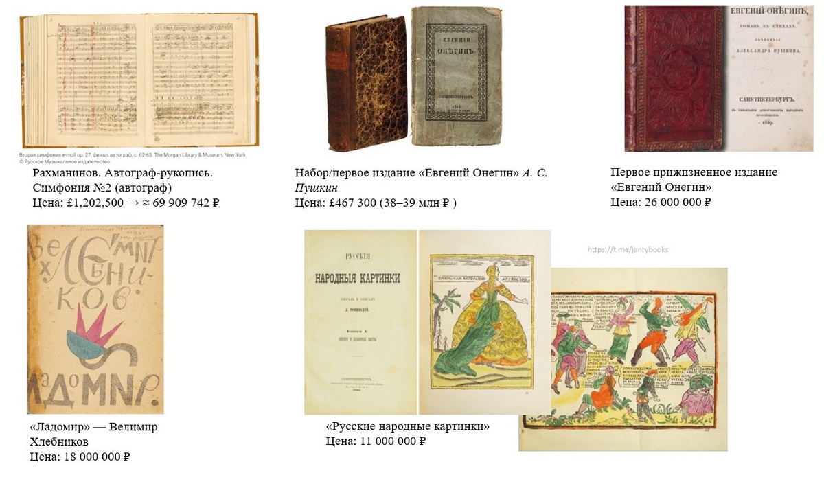 Не так давно я писала о некоторых из самых дорогих книг мира, проданных на аукционах, и я задумалась, а какие отечественные книги/рукописи продавались на аукционах по самой высокой цене. Итак, готовы узнать? 1. Автограф-Рукопись Второй симфонии Сергея Рахманинова Цена: £1 202 500 (около 69,9 млн рублей по курсу) Аукцион: Sotheby’s, Лондон, 20 мая 2014 года. Особенности: Автограф композитора, считавшийся утраченным. Рукопись имеет мировое значение и относится к первой категории ценности. Рукопись долгое время находилась в Британской библиотеке, а затем была приобретена Леманом на аукционе Sotheby’s. После продажи цифровая копия стала доступна российским исследователям. 2. Набор/первое издание «Евгений Онегин» А.С. Пушкина (лот Christie’s) Цена: 467 300 фунтов стерлингов (около 38-39 млн рублей) Аукцион: Christie’s, Лондон, 2019 год. Особенности: Большой комплект первых изданий романа. Особый интерес коллекционеров вызвало издание первой главы романа в оригинальном переплёте, входившее