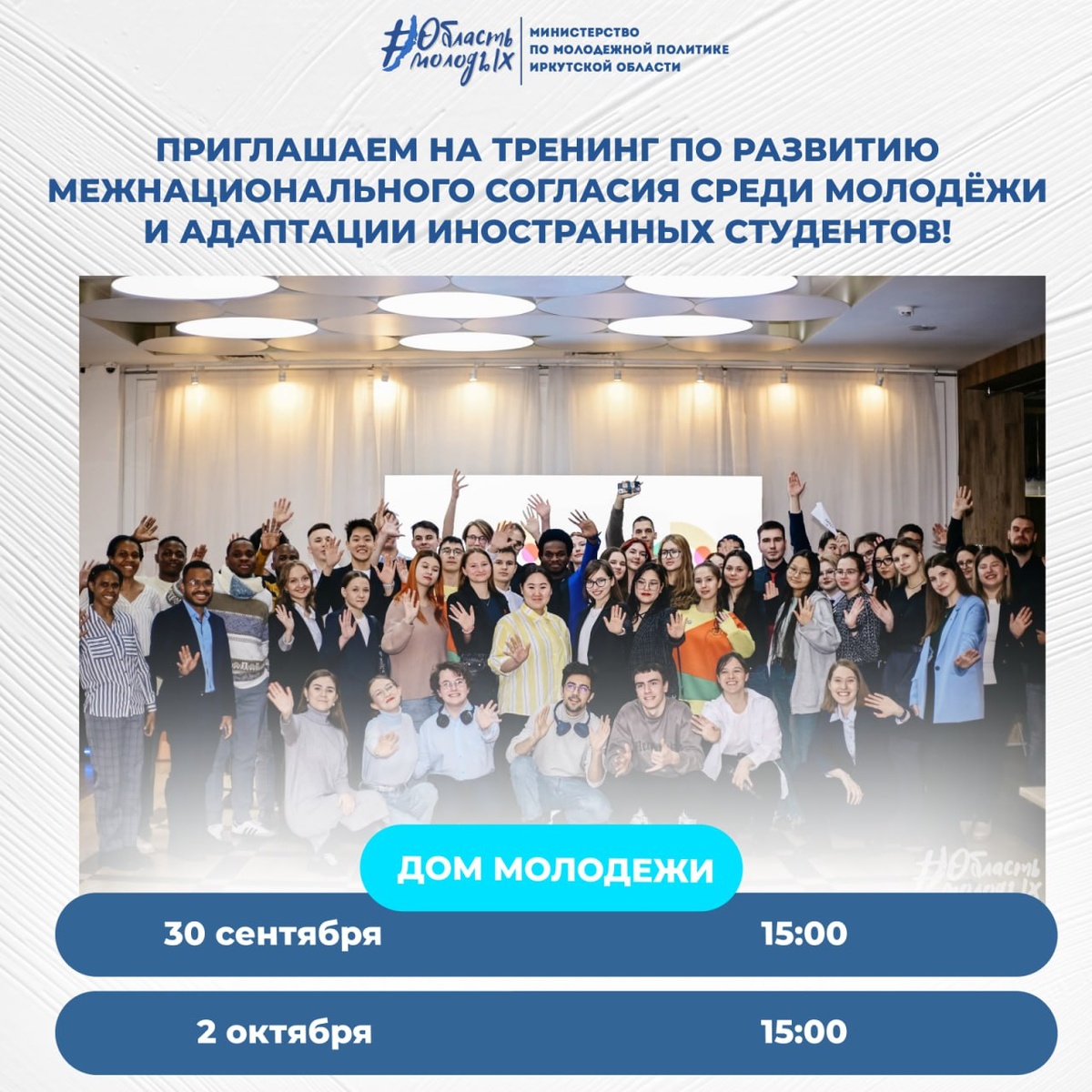 Меняем мир вместе! 🌐 Приглашаем на тренинг по развитию межнационального согласия среди молодёжи и адаптации иностранных студентов. 📌 Что вас ждёт? 30 сентября: • выступления экспертов об успешных проектах в сфере межнационального взаимодействия; • международные возможности для активной молодёжи; • интерактивный тренинг от профессионального психолога; • командные игры для формирования крепких связей • нетворкинг и поиск партнёров. 2 октября: • стратегическая сессия на тему: «Развитие международного молодёжного сотрудничества в Иркутской области». Для кого это мероприятие? Участники – российские и иностранные студенты, представители молодёжных объединений в возрасте от 18 до 35 лет. Мы ждём тех, кто заинтересован в укреплении межкультурного диалога, развитии контактов с представителями разных национальностей, и вовлечении в проекты международного уровня! 🚩Регистрация по ссылке. ▫️ Дресс-код: Casual. Открой для себя путь в мир диалога и сотрудничества между народами мира