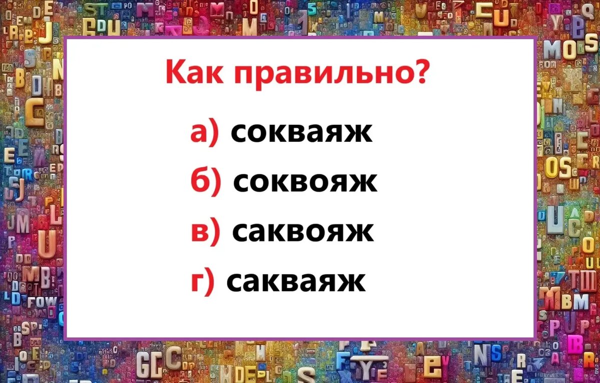 На русском оно пишется так — «саквояж» (вариант «в»). Если вы ответили именно так, поздравляем! Проверка на грамотность пройдена на «5+»!