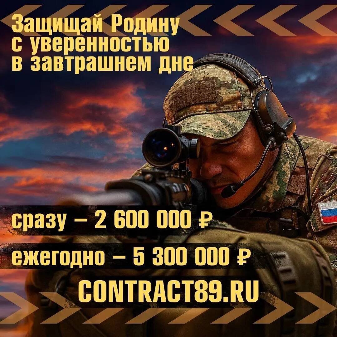 Служба по контракту — это осознанный выбор в пользу стабильности и надёжного социального положения Вступившие в ряды ВС РФ получат достойное материальное обеспечение, включая существенные выплаты, а также полный пакет государственных гарантий. Подписавшим контракт гарантированы: • единовременно — 2,6 млн рублей • ежегодно — 5,3 млн рублей • ежемесячно в зоне СВО — от 210 тысяч рублей Подробнее на сайте: contract89.ru ❤️ Импульс Севера