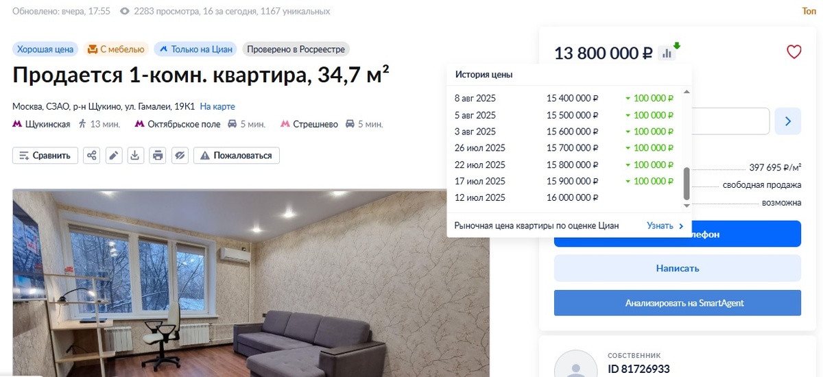 12 июля этого года собственник решил свою квартиру продать. И выставил её за 16 млн. По прошествии 5 дней снизил до 15,9 млн, ещё через 5 дней - до 15,8 млн, ещё через 4 дня до 15,7 млн. С 23 сентября стоимость этой квартиры 13,8 млн. Но количество просмотров всё ещё не внушает оптимизма