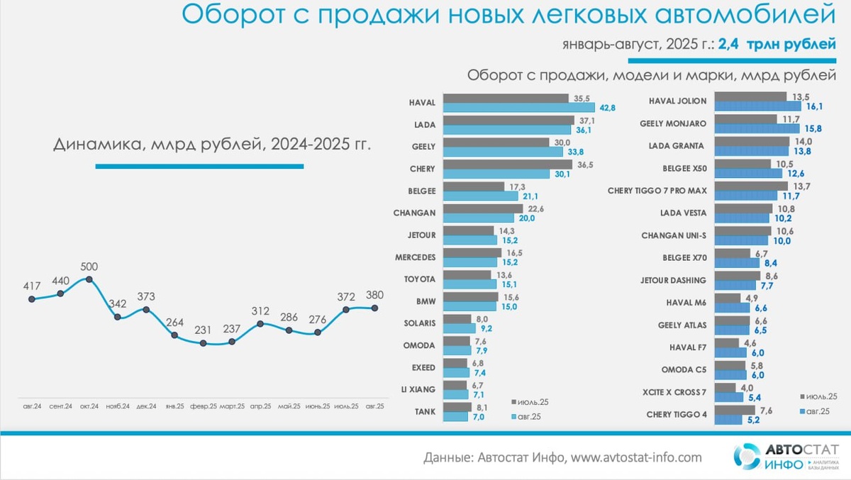 Оборот на авторынке в августе: 380 млрд рублей, SUV доминируют, китайские хиты впереди По данным «Автостат Инфо», августовский оборот продаж новых легковых автомобилей в России составил 380 млрд рублей, что на 2,3% выше, чем в июле. С начала года рынок собрал около 2,4 трлн рублей выручки. При этом вся картина остается предельно SUV-центричной: по накопленному итогу 2025 года на кроссоверы приходится около 81% кассы (≈1,91 трлн рублей из совокупных сегментных 2,36 трлн рублей), тогда как доля «легковых» классов В/С/В+ суммарно близка к четверти оборота. Средневзвешенные цены в августе в массовых сегментах заметно не вышли за рамки годовых коридоров: у SUV средний чек 3,50 млн рублей — чуть ниже среднегодового уровня (−39 тыс. рублей), у В-класса 1,09 млн рублей, у В+ 1,69 млн рублей, у С-класса 2,60 млн рублей, что указывает скорее на стабилизацию, чем на новый виток удорожания. В августе касса сместилась в сторону Haval и Geely: Haval поднялся до 42,8 млрд рублей против 35,5 млрд р