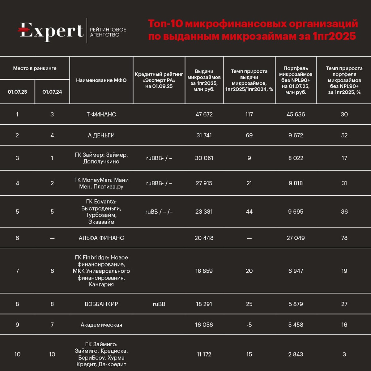 🔍🔍🔍🔍🔍🔍Рынок МФО в первом полугодии 2025 года На микрофинансовом рынке наблюдается активный рост выдачи и портфеля, сопровождаемый стагнацией прибыли. 🟢Объем выдачи микрозаймов увеличился на 61% в 1 п/г 2025 г. по сравнению с аналогичным периодом прошлого года. 🟢Объем портфеля вырос на 46% за период с 01.07.2024 по 01.07.2025. 🔴Прибыль сократилась на 5% относительно первого полугодия. Перспективы рынка микрофинансирования остаются благоприятными до конца 2025 года. Развитие рынка остается в рамках трендов, указанных агентством «Эксперт РА» в исследовании за 2024 год: прирост выдачи и портфеля в 2025 году прогнозируется на уровне 60 и 50% соответственно с сохранением потенциала ускоренного роста со стороны банковских МФО. В рэнкинге МФО по объему выдачи лидируют: 1️⃣«Т-Финанс» – 47,67 млрд руб.; 2️⃣«А Деньги» – 31,74 млрд руб.; 3️⃣ГК Займер – 30,06 млрд руб. Топ-10 компаний – на картинке 👆 📄 Обзор рынка МФО за 1 п/г 2025 г. и топ-20 компаний по выдаче – по ССЫЛКЕ 📄 Вс